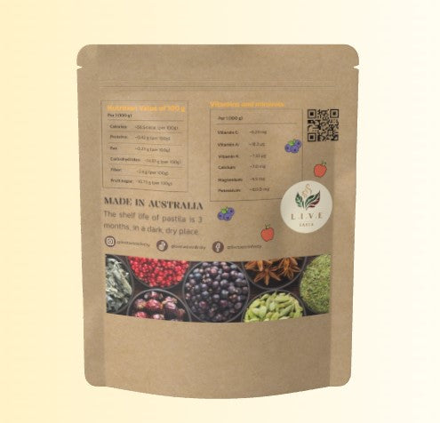 Nutritional value of 100 g of fruit leather (pastila) made from 70% apples and 30% blueberries with a little honey: