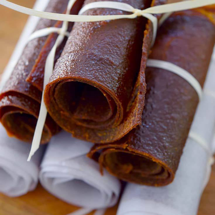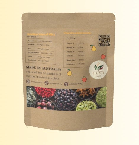 Nutritional value of 100 g of fruit leather (pastila) made from 50% apples and 50% pears with a little honey: